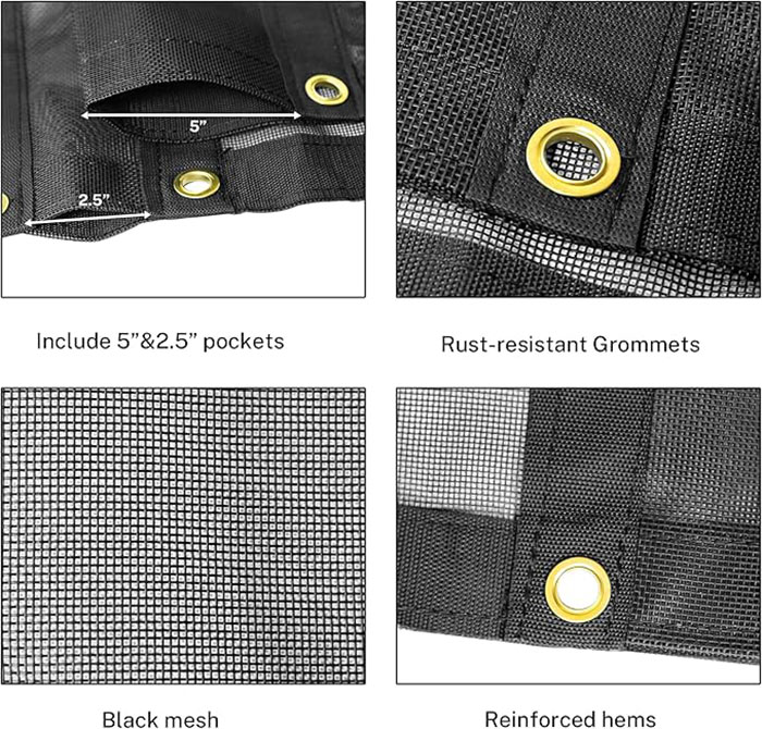| Application: | Mesh tarp made of high-density PVC fabric, offering durability and breathability. It is tear-resistant, UV-resistant, and built to withstand strong winds and extreme weather. Features reinforced corners and double-stitched edging for extended life. |